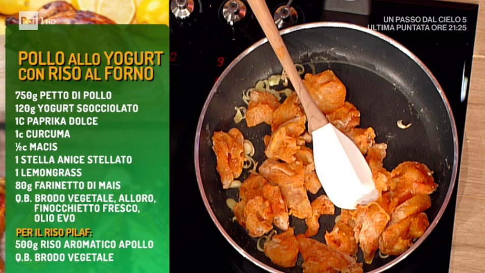 - 750 g petto di pollo, 120 g yogurt greco, 1 c paprika dolce, 1 c curcuma, mezzo c macis, 1 stella di anice stellato, 1 lemongrass, 80 g farinetto di mais, brodo vegetale, alloro, finocchietto fresco, olio evo