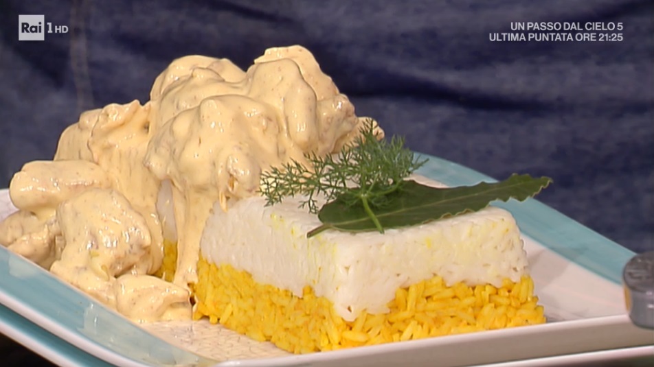 In un tegame, scaldiamo un filo d’olio con del lemograss affettato finemente e mettiamo a tostare il riso apollo. Copriamo con il brodo (il doppio del volume del riso), mettiamo il finocchietto e chiudiamo con il coperchio. Portiamo in forno caldo a 180° per 11 minuti. All’uscita dal forno, dividiamo il riso in due parti. Ad una uniamo un po’ di curcuma, in modo da colorarlo di giallo. Trasferiamo all’interno di uno stampo da plumcake e compattiamo alla base. Distribuiamo sopra il riso ancora bianco e lo compattiamo. Sformiamo su un piatto da portata il riso e versiamo sopra il pollo con la sua salsa.