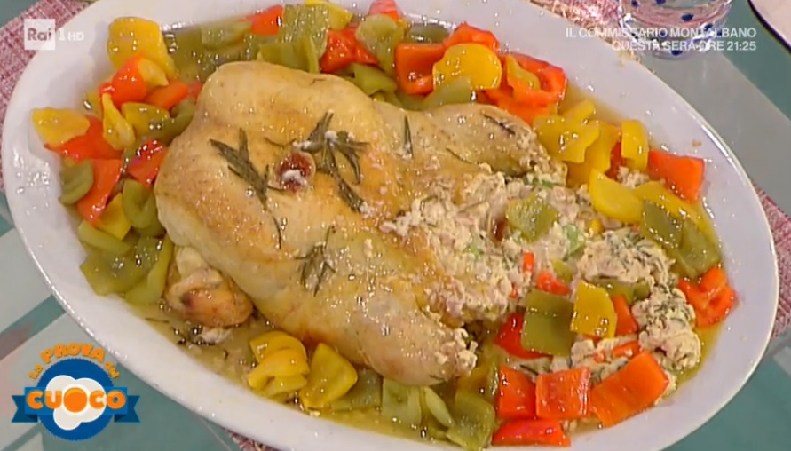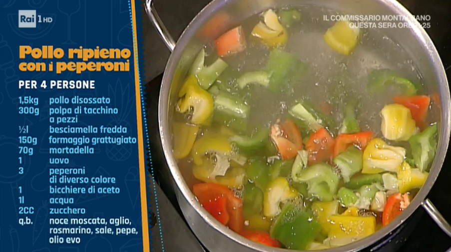 - 1,5 Kg pollo disossato, 300 g polpa di tacchino a pezzi, mezzo l besciamella, 150 g formaggio grattugiato, 70 g mortadella, 1 uovo, 3 peperoni, 1 bicchiere di aceto, 1 l acqua, 2 cc zucchero, noce moscata, aglio, rosmarino, sale, pepe