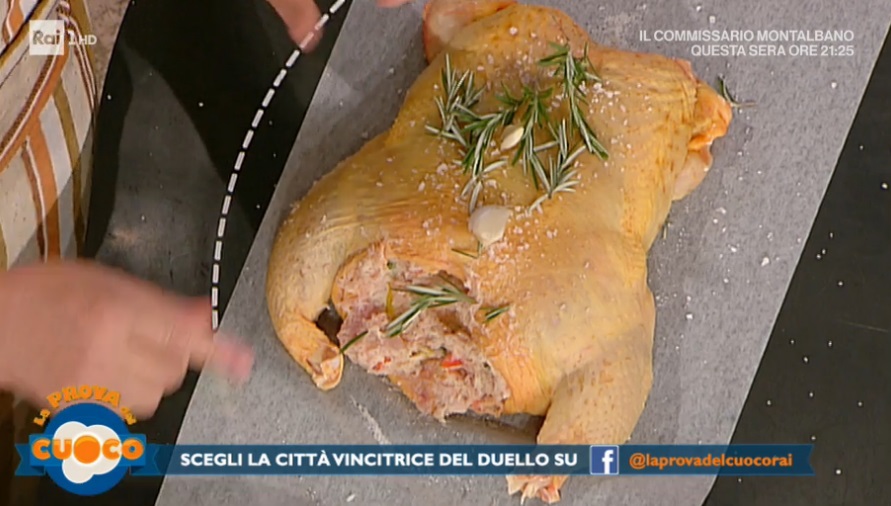 Farciamo il pollo disossato con il composto ottenuto. Su due fogli di carta forno disposti a croce, mettiamo del sale, rosmarino ed uno spicchio d’aglio con un filo d’olio. Adagiamo al centro il pollo farcito, quindi saliamo in superfice e profumiamo ancora con rosmarino ed aglio. Finiamo con un filo d’olio ed arrotoliamo, stretto, nella carta forno. Cuociamo in forno preriscaldato a 180° per 1 ora e mezza.