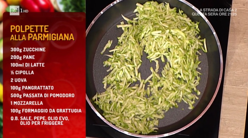 - 300 g zucchine, 200 g pane, 100 ml latte, mezza cipolla, 2 uova, 100 g pangrattato, 500 g passata di pomodoro, 1 mozzarella, 100 g formaggio da grattugia, sale, pepe, olio, olio per friggere