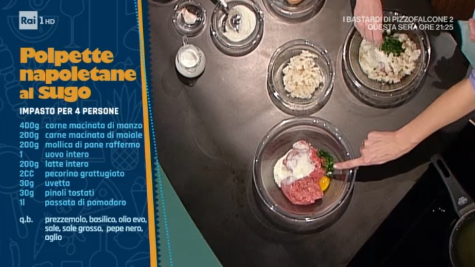 - 400 g macinato di manzo, 200 g macinato di maiale, 200 g mollica di pane raffermo, 1 uovo intero, 200 g latte intero, 2 cc pecorino grattugiato, 30 g uvetta, 30 g pinoli tostati, 1 l passata di pomodoro, prezzemolo, basilico, olio evo, sale, pepe, aglio