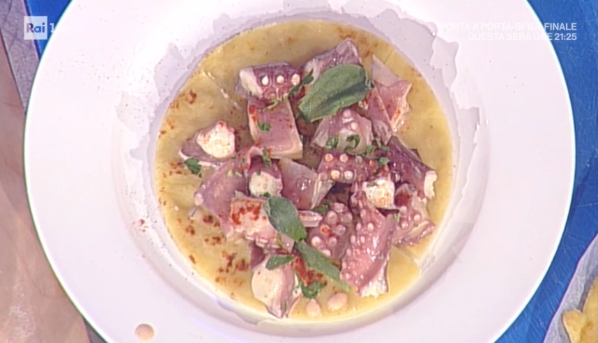 Lessiamo le patate nella’acqua di cottura del polpo. Le schiacciamo, le facciamo raffreddare e le lavoriamo con la farina ed il burro a pomata (fuso e fatto raffreddare). Stendiamo l’impasto ottenuto, in modo da formare un disco spesso circa mezzo cm. Mettiamo a cuocere in padella con un filo d’olio. Saliamo appena. Otterremo una tortilla. Una volta dorata su entrambi i lati, la tagliamo a spicchi.