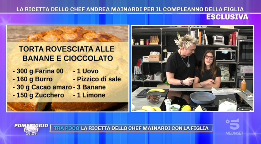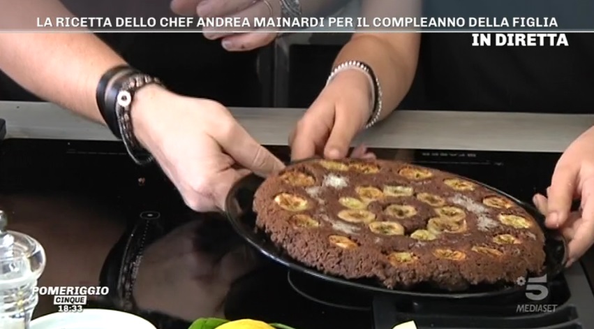 Peliamo le banane e la tagliamo a tocchetti alti circa 3-5 cm. Irroriamo le banane con del succo di limone. Posizioniamo su una padella adatta alla cottura in forno o su una teglia un disco di carta forno che copra il fondo ed i lati. Alla base disponiamo le rondelle di banana. Copriamo con le briciole di impasto, schiacciando leggermente con le mani. Cuociamo in forno caldo e statico a 170° per 30 minuti. Una volta fredda, capovolgiamo la torta. Andrea la arricchisce con una meringa all’italiana fiammeggiata.