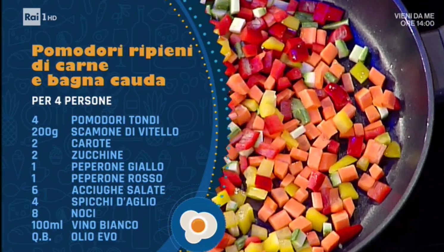 Con il proposito di “portare avanti” il lavoro iniziato da Antonella Clerici 18 anni prima, Elisa Isoardi prende il timone de La prova del cuoco e, al fianco di Andrea Lo Cicero, introduce la prima puntata della nuova edizione del programma di Rai1. L’argomento di oggi è il pomodoro. Beppe Sardi è il primo cuoco di oggi, pugliese e di lunga esperienza. Prepariamo i pomodori ripieni di carne e bagna cauda.