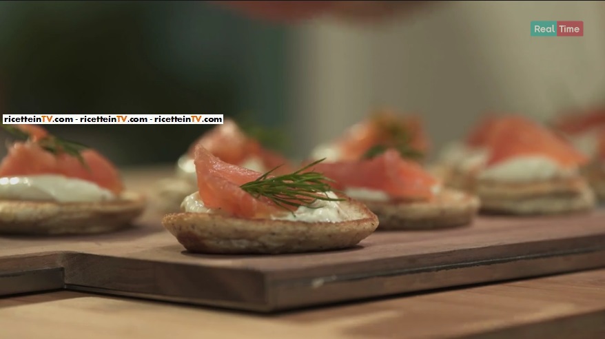Disponiamo su ogni bliny una cucchiaiata di questo composto e un pezzo di salmone.