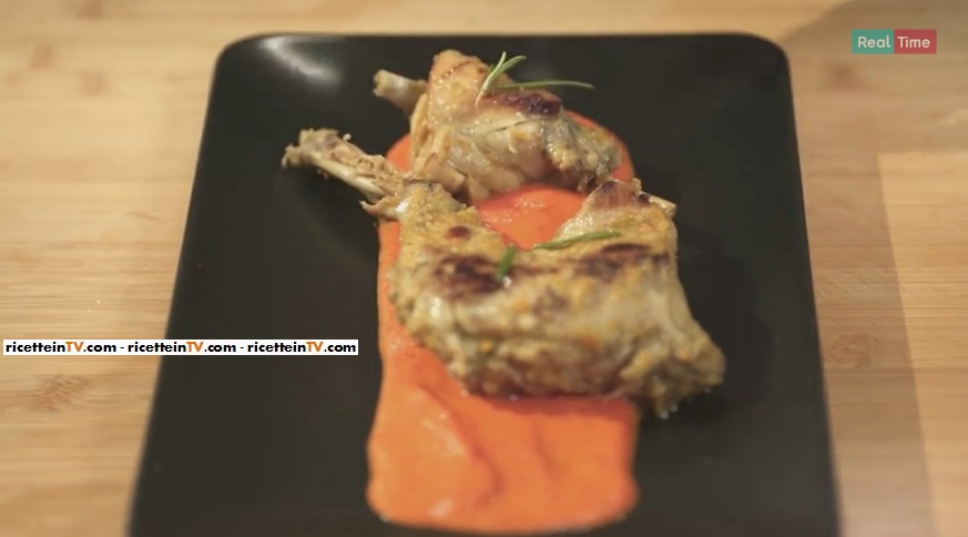 Frulliamo i peperoni ben cotti ad immersione, fino a ottenere una crema. Serviamo il coniglio su salsa di peperoni, decorando con il rosmarino.