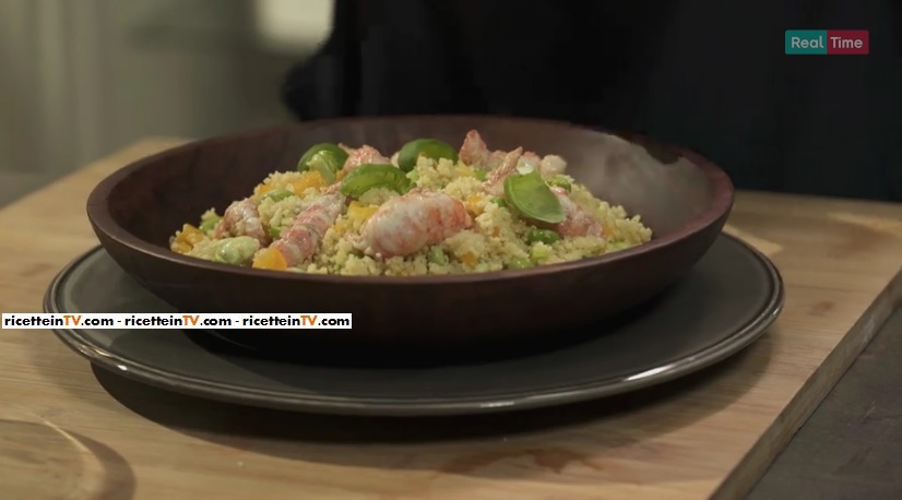 - 200 g cous cous, 200 g di scampi, Edamame qb, Fave qb, Un cipollotto, Un peperone giallo, Vino bianco qb, Un cucchiaio di peperoncino in polvere, Olio extravergine di oliva qb, Sale, basilico qb