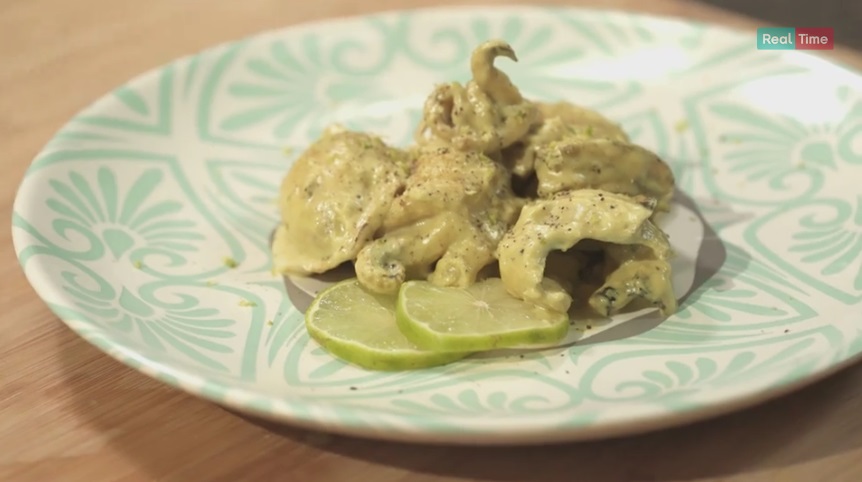 A fine cottura, aggiungiamo al sugo il succo di mezzo lime. Completiamo grattugiando la scorza di un lime, una manciata di pepe e una fettina di lime per guarnire.