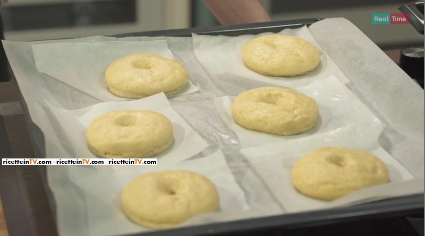 Stendiamo l’impasto su un piano infarinato e ritagliamo dei dischi. Eliminiamo la parte centrale con un levatorsolo o un coppapasta piccolo o ancora col beccuccio oliato o imburrato di una sac-à-poche. Appoggiamo i donuts su dei quadratini singoli di carta forno. Uno per per ogni ciambella. Facciamo lievitare la pasta ancora mezz’ora. Immergiamo, con tutta la carne, in abbondante olio caldo, ma non bollente. Li rigiriamo così che friggano anche sulla parte superiore. Devono cuocere piano, così non rischiano di essere pronti fuori ma crudi dentro. Lasciamo raffreddare su carta assorbente.