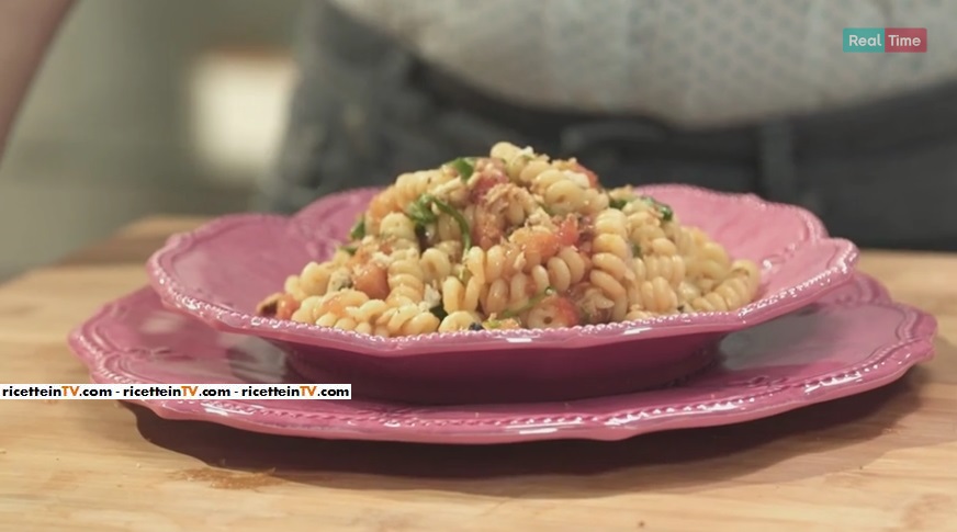 - 300 g di fusilli, 4 pomodori ramati, 2 cipollotti, un limone, 3 fette di pane in cassetta, 50 g di olive nere, origano qb, 50 g di foglie di rucola, olio extravergine di oliva qb