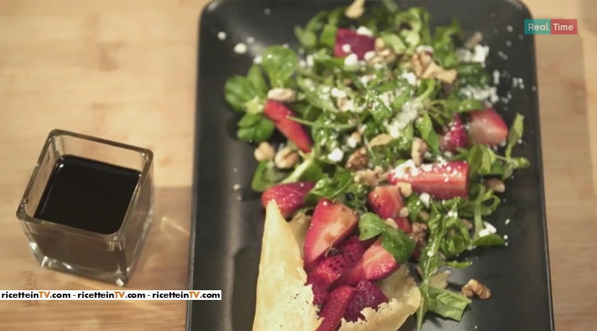 - 200g di insalata, 40g di noci, 100g di quartirolo, 12 fragole, aceto balsamico qb, parmigiano qb, 1-2 foglie di basilico, olio extravergine di oliva qb, sale qb