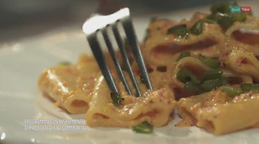 Scoliamo i paccheri e li ripassiamo in padella con la crema di peperoni. Finiamo col peperone verde fritto, una macinata di pepe e un filo d’olio.