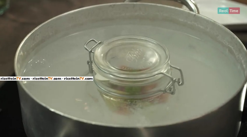 All’interno del vasetto di vetro mettiamo un goccino di olio, un primo strato di salmone, gli ingredienti affettati, alternandoli a piacere, ancora salmone, fettine di aromi, qualche foglia di basilico e un pizzico di sale. Concludiamo con un filo di olio, sale, pepe e 3 capperi. Chiudiamo il vasetto e cuociamo a bagnomaria per 15 minuti. Servire il vaso ancora chiuso.