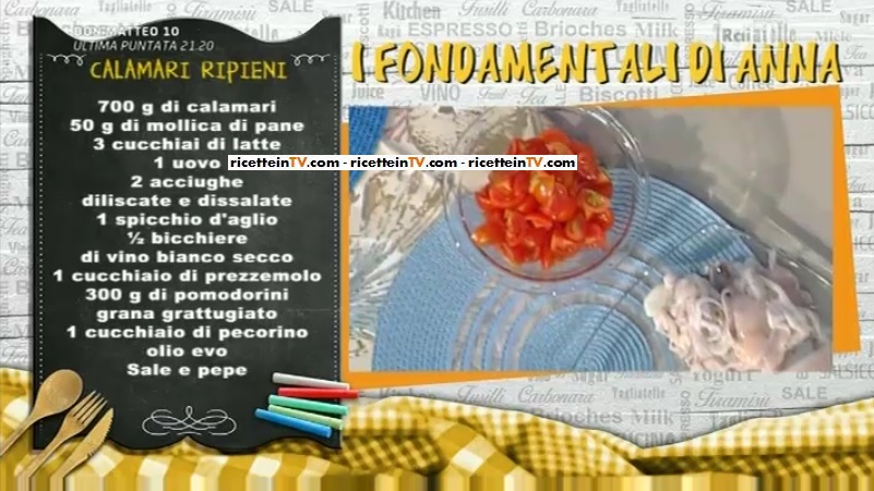 - 700 g calamari, 50 g mollica di pane, 3 cucchiai di latte, 1 uovo, 2 acciughe, 1 spicchio d’aglio, 1/2 bicchiere di vino bianco secco, 1 cucchiaio di prezzemolo, 300 g pomodorini, grana grattugiato, 1 cucchiaio di pecorino, olio evo, sale e pepe