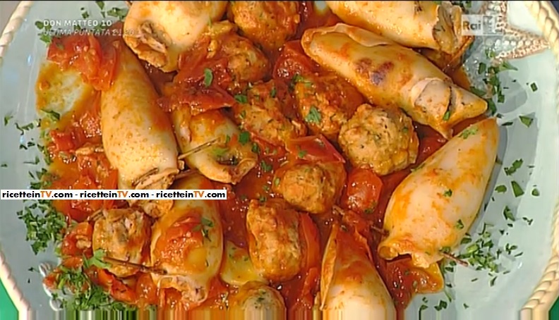 Puliamo i calamari e mettiamo i tentacoli e le ali in un mixer. Frulliamo grossolanamente. Intanto, in una padella scaldiamo l’olio con l’aglio pelato; uniamo i pomodorini tagliati in quarti e lasciamo cuocere. Mettiamo i calamari tritati in una ciotola con un uovo, il prezzemolo tritato, un’acciuga tritata, il parmigiano ed il pecorino se vogliamo, il pane ammollato nel latte e ben strizzato; saliamo e pepiamo. Mescoliamo per bene. Farciamo i calamari con il ripieno ottenuto (non troppo, o si apriranno in cottura) e sigilliamo l’apertura con uno stecco di legno. Rosoliamo i calamari in padella con un filo d’olio; li sfumiamo con il vino bianco. Uniamo i pomodorini saltati in padella e facciamo cuocere 10 minuti circa.