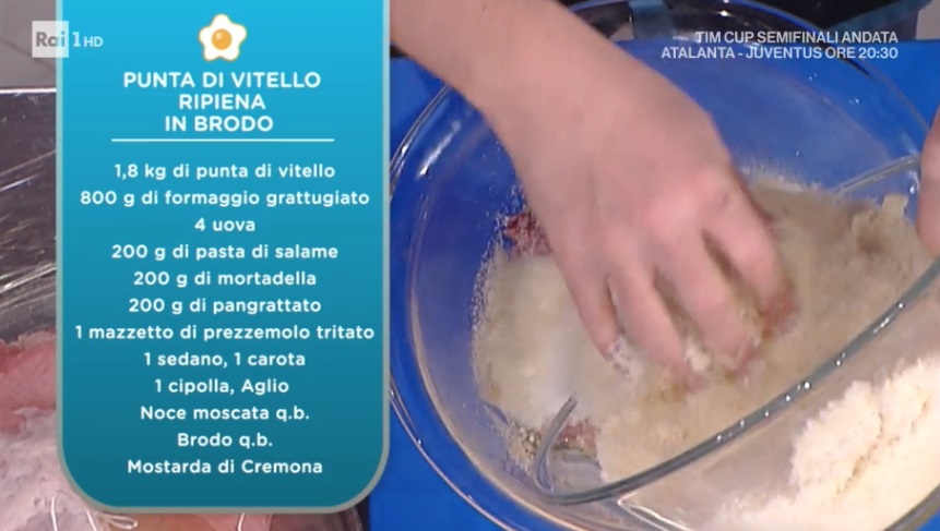 punta di vitello ripiena in brodo di Daniele PerseganiE’ martedì. Inevitabile, su La prova del cuoco, si abbatte il ciclone Persegani. Il cuoco emiliano si prepara a servire un secondo piatto ricchissimo. Prepariamo punta di vitello ripiena in brodo.
