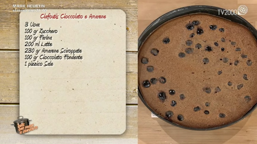 - 3 uova, 100 g zucchero, 100 g farina, 200 ml latte, 230 g amarene sciroppate, 100 g cioccolato fondente, 1 pizzico di sale