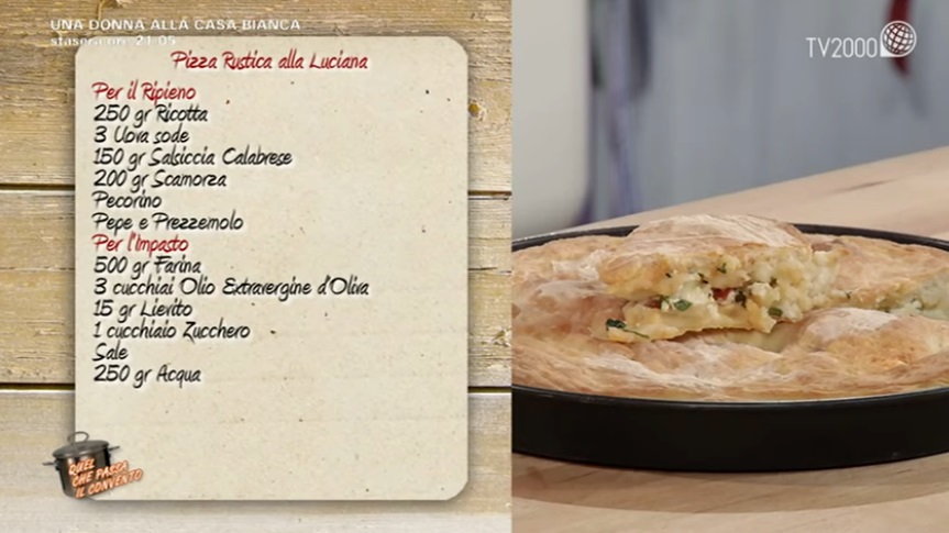 pizza rustica alla LucianaAll’interno di Quel che passa il convento, il programma mattutino di Tv2000 (dal lunedì al venerdì alle 11:00) dedicato alla cucina semplice, ‘di casa’, è stata proposta la ricetta della pizza rustica alla Luciana. Ecco ingredienti e procedimento.