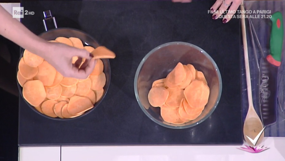 Peliamo e tagliamo a fette sottili le patate dolci (quelle arancioni, anche dette batate). Ungiamo una teglia dai bordi alti e disponiamo le patate a fette sul fondo ed ai lati, sovrapponendole leggermente. Le saliamo e le pepiamo, quindi inforniamo a 180° per 20 minuti.