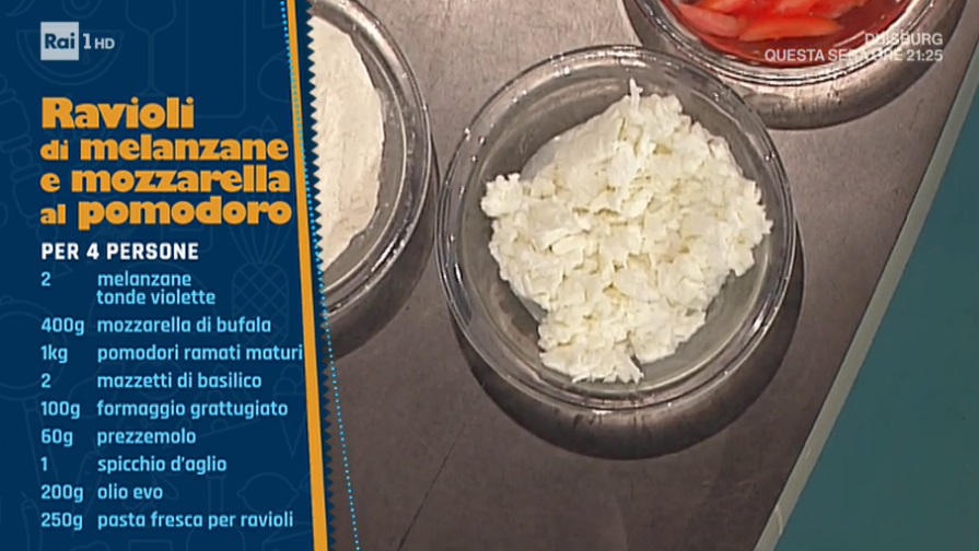 - 2 melanzane tonde violette, 400 g mozzarella di bufala, 1 Kg pomodori ramati maturi, 2 mazzetti di basilico, 100 g formaggio grattugiato, 60 g prezzemolo, 1 spicchio d’aglio, 200 g olio evo, 250 g pasta fresca per ravioli