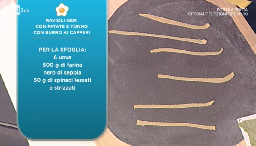 - Sfoglia: 6 uova, 500 g farina, nero di seppia, 50 g spinaci lessati e strizzati.