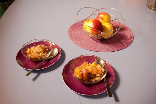 Ingredienti: 500g di pesche noci, 5 bacche di cardamomo, 50g di zucchero di canna, 50g di semola, 70g di granola, 25g di olio di cocco, 1 pizzico di sale.