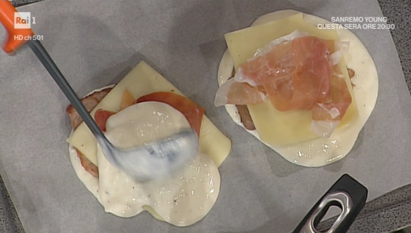 Posizioniamo un foglio di carta su una teglia. Mettiamo un cucchiaio di besciamella. Posizioniamo sopra le fettine di carne rosolate, copriamo con una fettina di formaggio Edamer ed una di prosciutto crudo. Copriamo con un altro cucchiaio di besciamella. Continuiamo così con le altre fette di carne. Mettiamo in frigorifero per almeno 1 ora, in modo che la besciamella si indurisca.