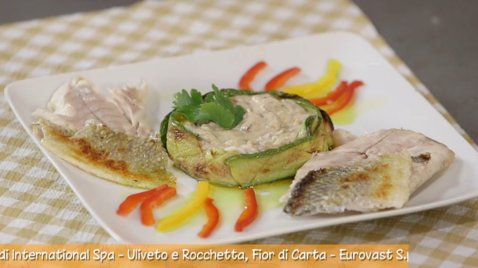Sul piatto da portata, posizioniamo un coppapasta e foderiamo i bordi con le zucchine grigliate. Riempiamo l’anello con la crema di melanzane. Adagiamo a fianco i filetti di branzino senza pelle. Finiamo con un filo d’olio.