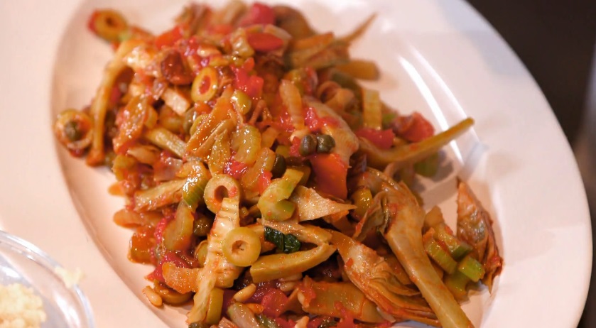 Puliamo i carciofi e ne tagliamo i cuori a spicchi. Li sbollentiamo in acqua acidulata con aceto e sale per qualche minuto. Scoliamo e trasferiamo in padella con olio ed aglio. Uniamo le olive verdi denocciolate e a rondelle, i cappri dissalati, dei pomodori pelati, dei pinoli e dell’uvetta rinvenuta in acqua tiepida. A piacere, aggiungiamo del peperoncino. Uniamo anche il sedano a rondelle precedentemente sbollentato e completiamo la cottura.