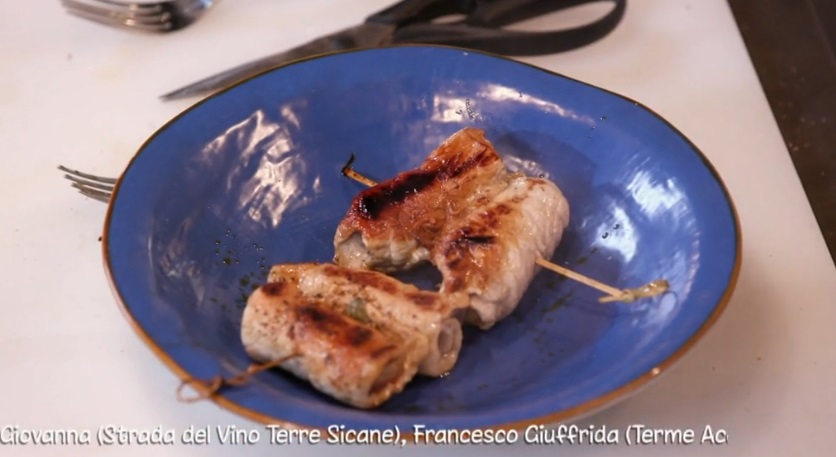 Con l’avanzo di pancetta arrotolata, Anna prepara degli involtini veloci. Stendiamo le fettine di carne sottili su un piano e disponiamo sopra un pezzo di pancetta arrotolata ed una foglia di salvia. Arrotoliamo, in modo da formare l’involtino. Inseriamo 2-3 involtini in uno stecco da spiedino. Mettiamo a cuocere in padella con un filo d’olio ben caldo ed uno spicchio d’aglio. Spolveriamo con pepe e sale e sfumiamo con brodo o vino bianco. Completiamo la cottura, coperti.