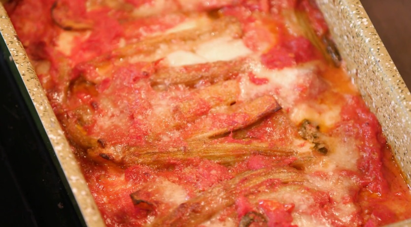 Su una pirofila imburrata disponiamo i cardi fritti. Condiamo con un po’ di sugo di pomodoro, spolveriamo di parmigiano grattugiato e mettiamo la mozzarella. Facciamo un’altro strato di cardi, formaggio, mozzarella e sugo e così via, fino ad esaurire gli ingredienti. Finiamo con mozzarella, formaggio e salsa. Inforniamo per 30 minuti a 180°.