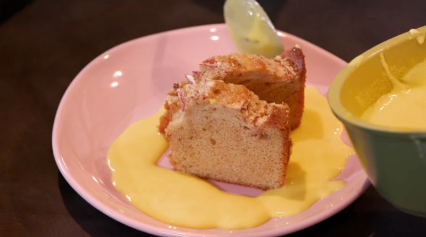 Accompagniamo con la crema inglese. Per prepararla, basta mettere in un pentolino 2 rossi d’uovo con 1 cucchiaio di zucchero per rosso e 100 g di latte per rosso (quindi, in questo caso, 2 cucchiai di zucchero e 200 g di latte). Mescoliamo, accendiamo il fuoco e scaldiamo lentamente, continuando a mescolare. Quando la crema vela il cucchiaio, è pronta.