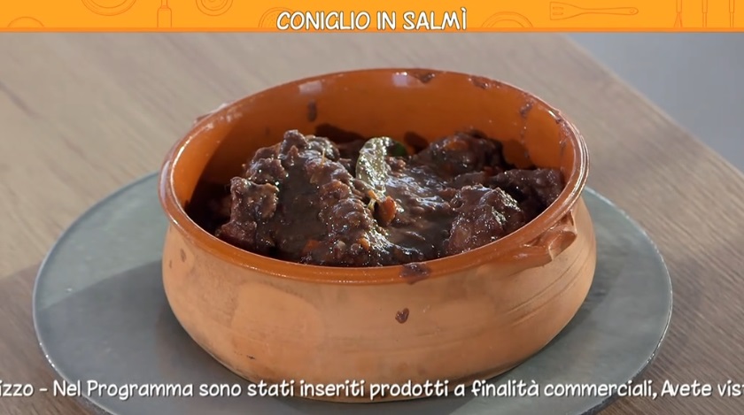 - 1 coniglio tagliato a pezzi, 120 g pancetta stesa, 60 g burro, 2 cipolle, 1 carota, 2 gambi di sedano, 1 l vino rosso, 2 cucchiai di farina, aglio, timo