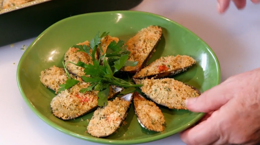 In una ciotola, mescoliamo il pecorino grattugiato con il pangrattato, l’aglio tritato, un filo d’olio ed il prezzemolo tritato. Copriamo ogni cozza con poca panure. Inforniamo a 200° per 8-10 minuti (devono dorare leggermente).