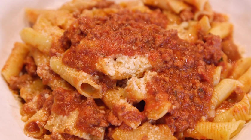 Cuociamo i garganelli in acqua bollente e salata. Scoliamo e condiamo con ragù classico e di fagioli insieme. Finiamo con formaggio grattugiato.