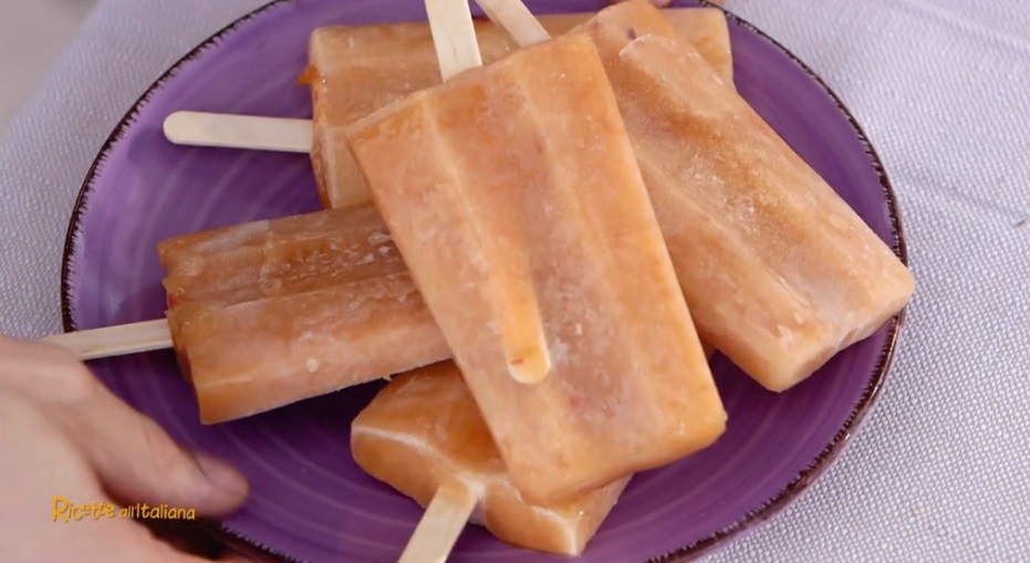 Versiamo la miscela negli appositi stampini per ghiaccioli, lasciando liberi pochi millimetri dal bordo. Inseriamo gli stecchi per ghiaccioli e mettiamo a congelare.