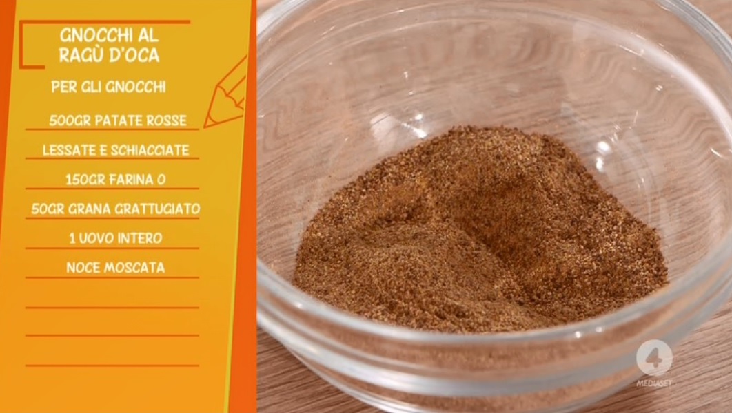 - per gli gnocchi: 500 g di patate rosse lessate e schiacciate, 150 g di farina 0, 50 g di grana grattugiato, 1 uovo intero, noce moscata qb