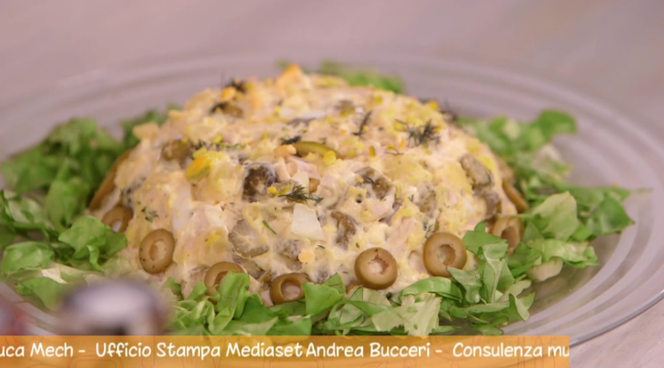 - 600 g petto di pollo lessato, 100 g cetriolini sottaceto, 300 g patate lesse, olive verdi, 2 uova sode, capperi