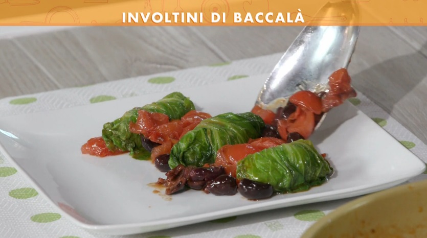 Tagliamo il baccalà dissalato a pezzettoni, quindi passiamo quest’ultimi in una panatura di pane in cassetta e noci tritati insieme. A questo punto, avvolgiamo ogni trancio di baccalà panato in una foglia di scarola. Mettiamo a cuocere gli involtini ottenuti in padella, con il sughetto.