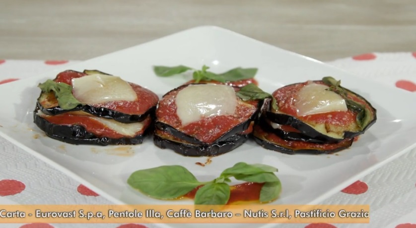 Su una teglia, quindi, adagiamo una fetta di melanzana, che copriamo con un po’ di sugo di pomodoro, una spolverata di formaggio stagionato grattugiato ed una fettina di formaggio semi stagionato. Proseguiamo con uno strato di melanzana, di sugo, formaggi e ancora melanzana, sugo e formaggi. Proseguiamo in questo modo, fino a formare 4 strati e varie torrette. Passiamo in forno preriscaldato a 200° per 5 minuti circa.