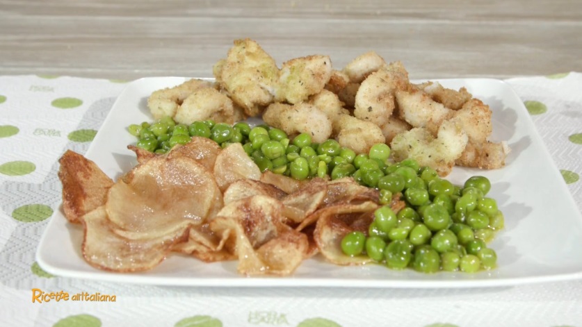 Serviamo il palombo con un contorno di patatine fritte e piselli già cotti e saltati in padella con olio ed aglio.