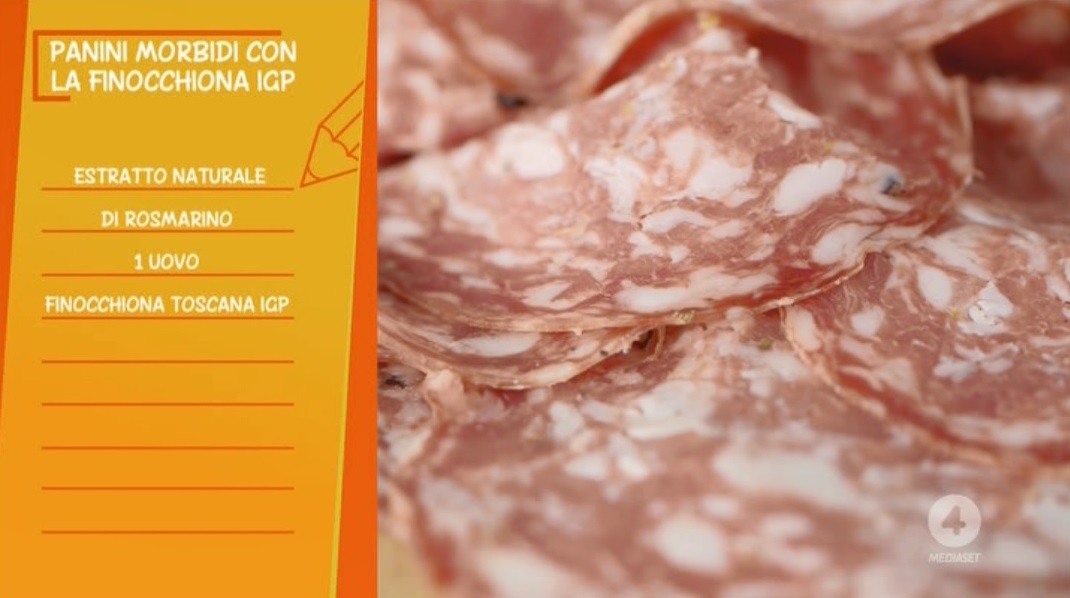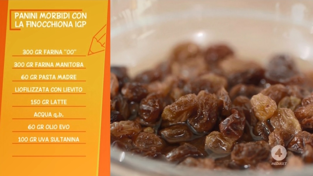 - 300 g di farina 00, 300 g di farina manitoba, 60 g di pasta madre liofilizzata con lievito, 150 g di latte, acqua qb, 60 g di olio evo, 100 g di uva sultanina, estratto naturale di rosmarino, 1 uovo, finocchiona toscana qb
