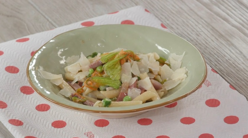 - 320 g penne rigate, 300 g piselli freschi, 150 g speck, 200 g asparagi, 10 fiori di zucca, scalogno, burro, scaglie di formaggio, sale, pepe, olio evo