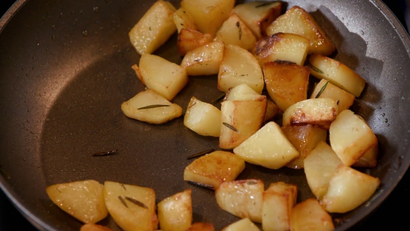 Peliamo le patate e le tagliamo a tocchetti medi. Le mettiamo in padella, con l’olio ben caldo, e saltiamo qualche istante (senza coperchio!). Profumiamo con rosmarino o altre erbe. Lasciamo rosolare così per 5-10 minuti, finchè appaiono dorate e morbide al taglio.