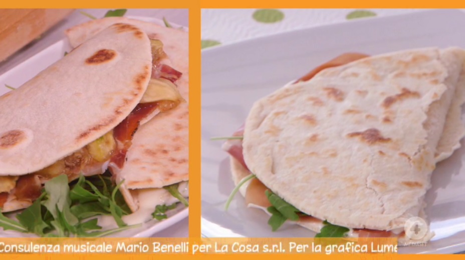 Farciamo a piacere con squacquerone (o stracchino) e rucola; oppure, prosciutto crudo, squacquerone e rucola. Possiamo aggiungere anche dei fichi freschi a fettine.