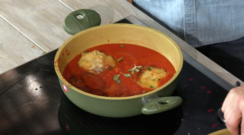 Friggiamo in due dita d’olio ben caldo fino a doratura. Scoliamo su carta assorbente e le ripassiamo per pochi istanti nel sugo di pomodoro.