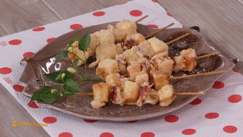 Tagliamo la fontina ed il prosciutto cotto a cubetti (di circa 2×2 cm). Tagliamo anche il semolino a cubetti della stessa grandezza. Su uno stecco da spiedino, quindi, alterniamo cubetti di semolino, prosciutto e fontina (iniziamo e finiamo lo spiedino con il semolino). Passiamo gli spiedini nella farina, nell’uovo sbattuto e, infine, nel pangrattato. Friggiamo in olio profondo e ben caldo fino a leggera doratura. Asciughiamo su carta assorbente e saliamo.