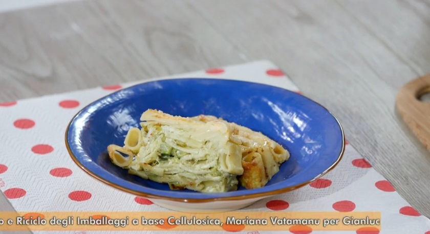 - 300 g pasta mezze candele, 2 uova, 300 g mozzarella, 100 g parmigiano grattugiato, 300 g zucchine, 450 g besciamella, 90 g pesto alla genovese