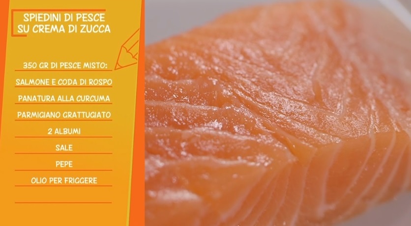 Tagliamo a dadini sia il salmone che la coda di rospo, saliamo e pepiamo. Li impaniamo passandoli nell’albume e poi nella panatura di curcuma a cui prima uniamo il formaggio grattugiato. Formiamo degli spiedini alternando i due tipi di pesce. Li cuociamo in padella con olio generoso. Li serviamo con la crema di zucca.